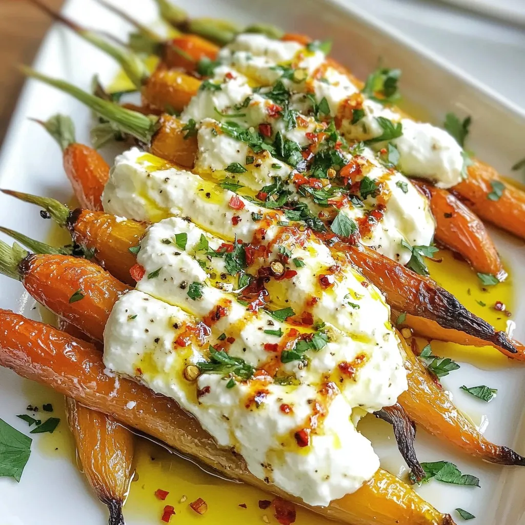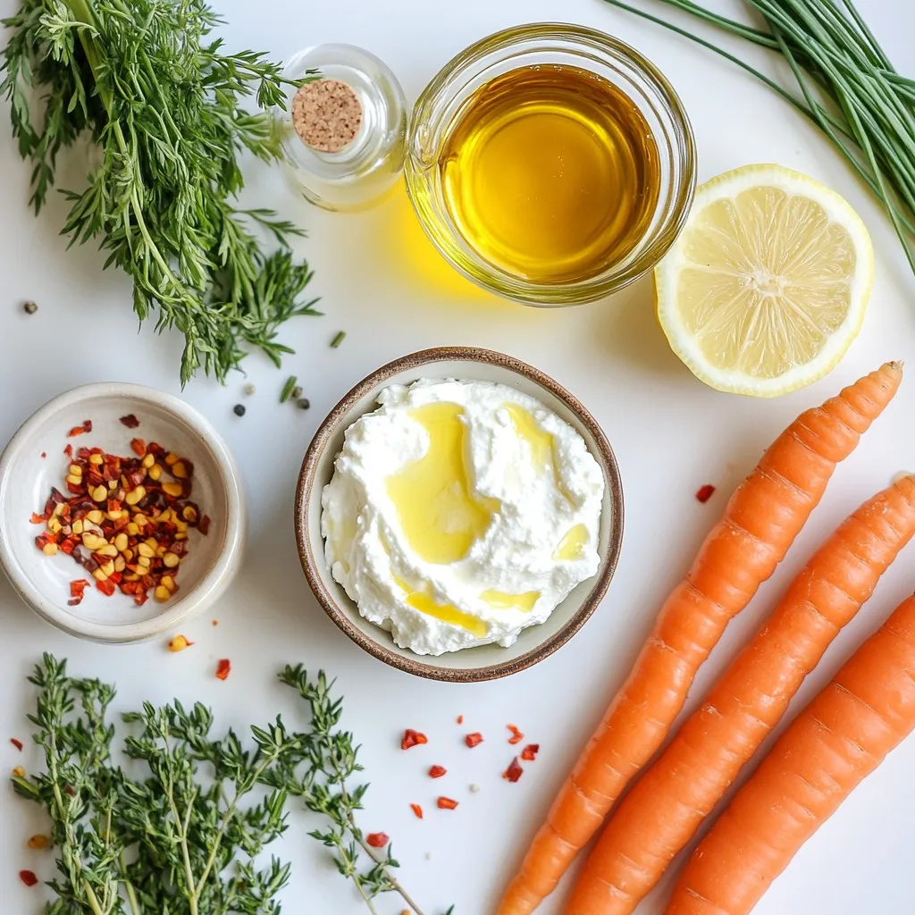 The main ingredients for this dish are simple yet impactful. Carrots bring a natural sweetness when roasted. Olive oil helps them caramelize. Salt and pepper enhance their flavors. Ricotta cheese adds creaminess. Honey contributes a sweet touch, while red pepper flakes give a nice kick. Lemon juice brightens the dish. Fresh herbs add a pop of color and taste.