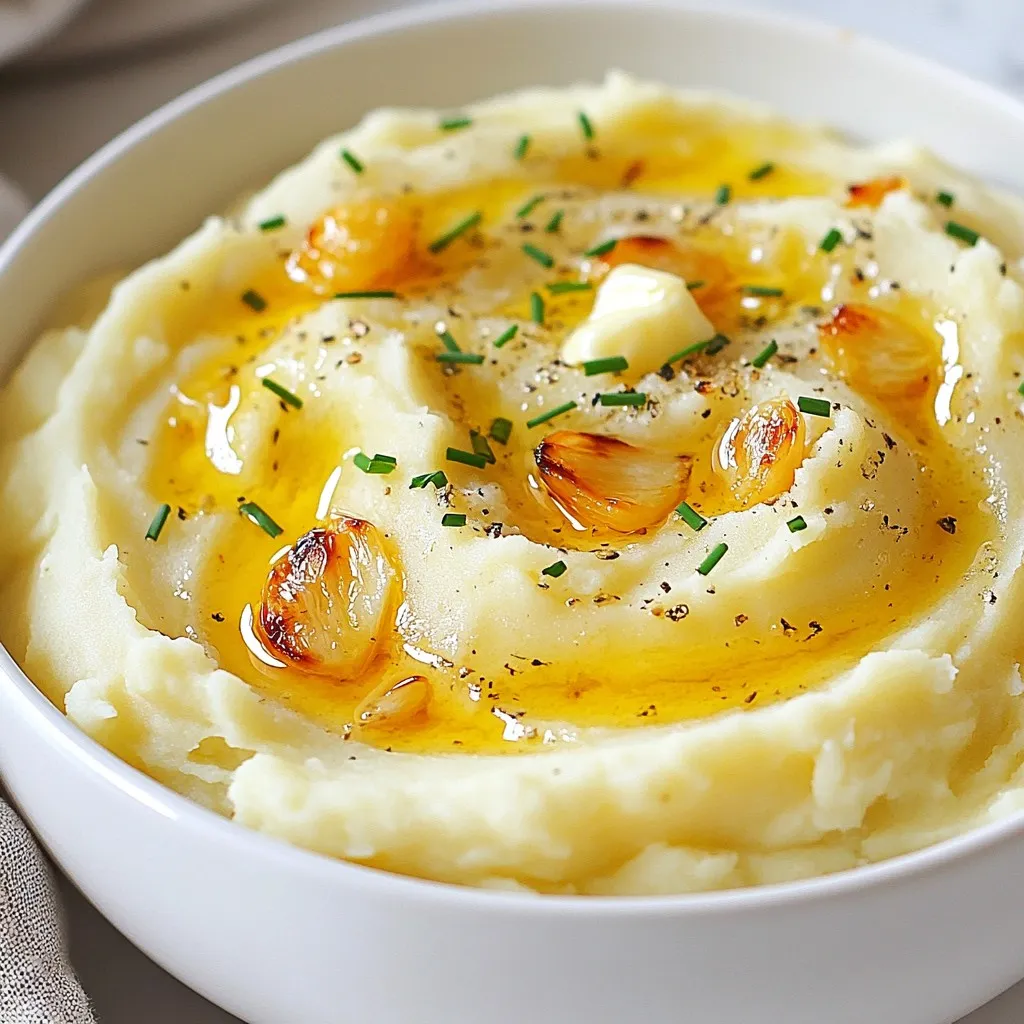 Creamy mashed potatoes infused with roasted garlic for a rich flavor.