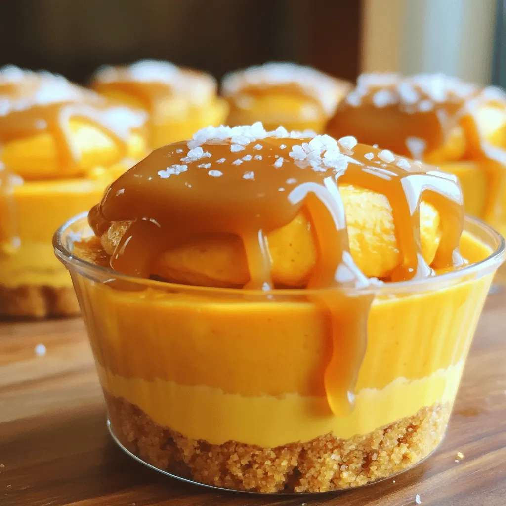To make these delightful Salted Caramel Pumpkin Cheesecake Cups, gather the following: - 1 cup graham cracker crumbs - 4 tablespoons unsalted butter, melted - 1 (8 oz) package cream cheese, softened - 1/2 cup powdered sugar - 1 cup pumpkin puree - 1 teaspoon vanilla extract - 1 teaspoon pumpkin pie spice - 1/2 cup heavy whipping cream - 1/4 cup salted caramel sauce (plus extra for drizzling) - Sea salt flakes for garnish You can easily swap some ingredients if needed: - Use gluten-free graham crackers for a gluten-free crust. - Swap cream cheese with dairy-free cream cheese for a vegan option. - Replace heavy cream with coconut cream for a dairy-free version. - Maple syrup can replace powdered sugar for a natural sweetener. Selecting the right ingredients makes a big difference: - Choose fresh pumpkin puree for the best flavor. Canned is okay, but fresh shines. - Look for high-quality cream cheese. A richer cream cheese makes the cheesecake smooth. - When picking graham crackers, look for ones with simple ingredients. This helps avoid added sugars. - For the salted caramel sauce, select a brand known for its rich flavor. Homemade sauce can also elevate your dish. To make the crust, start with graham cracker crumbs. In a medium bowl, mix 1 cup of crumbs with 4 tablespoons of melted butter. Use a fork to blend them well. This mixture should feel like wet sand. Next, take about 2 tablespoons of this mix and press it into the bottom of each serving cup. Make sure to press down firmly so it holds together. This forms a solid base for your cheesecake cups. For the cheesecake filling, grab a large mixing bowl. Beat 1 package of softened cream cheese until it’s creamy and smooth. Gradually add in 1/2 cup of powdered sugar, mixing until combined. Then, add 1 cup of pumpkin puree, 1 teaspoon of vanilla extract, and 1 teaspoon of pumpkin pie spice. Mix everything until it is all blended together. In a separate bowl, whip 1/2 cup of heavy cream until you see stiff peaks. Gently fold this whipped cream into the pumpkin mixture. Be careful not to deflate the whipped cream. This keeps your cheesecake light and fluffy. Now it's time to assemble! Spoon or pipe the pumpkin cheesecake mixture on top of the crust in each cup. Fill them to the brim for a nice presentation. Drizzle some salted caramel sauce over the top of each cup. For the final touch, sprinkle a few sea salt flakes on top. This adds a nice contrast to the sweetness. Finally, chill the cups in the refrigerator for at least 2 hours. This allows the cheesecake to set perfectly before serving. Enjoy your delicious salted caramel pumpkin cheesecake cups! To get a creamy filling, make sure your cream cheese is soft. Let it sit at room temperature for about 30 minutes. When mixing, beat it well until smooth. This helps to avoid lumps. When adding the whipped cream, fold gently. This keeps the mix light and fluffy. The goal is to have a light and airy cheesecake texture. You need a few simple tools for this recipe. A medium bowl works for the crust. Use a large bowl for the filling. A hand mixer or stand mixer is great for beating the cream cheese. You'll also need measuring cups and spoons. A spatula helps to fold the whipped cream. Lastly, grab serving cups or small glasses for the final assembly. One big mistake is not chilling the cups long enough. They need at least two hours in the fridge. This helps the layers set. Another error is over-mixing the whipped cream. If you mix too much, it can deflate. Lastly, don’t skip the sea salt on top. The salt enhances the sweetness and balances the flavor. {{image_2}} You can switch up the flavors in your salted caramel pumpkin cheesecake cups. For a rich twist, add chocolate. Use chocolate graham cracker crumbs for the crust. Mix melted chocolate into the cheesecake filling for a deep, creamy taste. Another great option is maple. Replace pumpkin pie spice with maple syrup. This adds a warm, sweet flavor that pairs nicely with the pumpkin. If you need a dairy-free version, swap out the cream cheese and heavy cream. Use a plant-based cream cheese and coconut cream. These options keep the texture creamy and rich while being dairy-free. For gluten-free needs, use gluten-free graham crackers. They work just as well for the crust, keeping it tasty and safe for everyone. These cheesecake cups shine on their own, but you can elevate them further. Serve them with a dollop of whipped cream on top. A sprinkle of crushed nuts adds a nice crunch. Pair these cups with a warm drink, like spiced apple cider or coffee. The flavors complement each other, making your dessert experience even more delightful. Store your salted caramel pumpkin cheesecake cups in the fridge. Use an airtight container to keep them fresh. This way, they stay cool and tasty. Avoid stacking them to keep the topping nice. If you have leftovers, eat them within three days for the best taste. You can freeze these cheesecake cups for a longer shelf life. First, let them chill completely in the fridge. Then, wrap each cup tightly in plastic wrap. Place them in a freezer-safe container or bag. They can last up to two months. When ready to eat, thaw them in the fridge overnight. These cheesecake cups are best enjoyed fresh. In the fridge, they last up to three days. If left out at room temperature, they only stay good for about two hours. To keep the flavors bright, store them as soon as you finish eating. Yes, you can make these cups ahead of time. They stay fresh in the fridge for up to three days. Just prepare them and chill. The flavors meld together nicely when they sit. You will enjoy the taste even more! If you don’t have heavy cream, try using coconut cream. It gives a nice texture and flavor. You can also use Greek yogurt as a lighter option. It may change the taste slightly, but it will still be delicious. You can customize the salted caramel topping in many ways. For a bolder flavor, add a pinch of cinnamon or nutmeg. You can also mix i