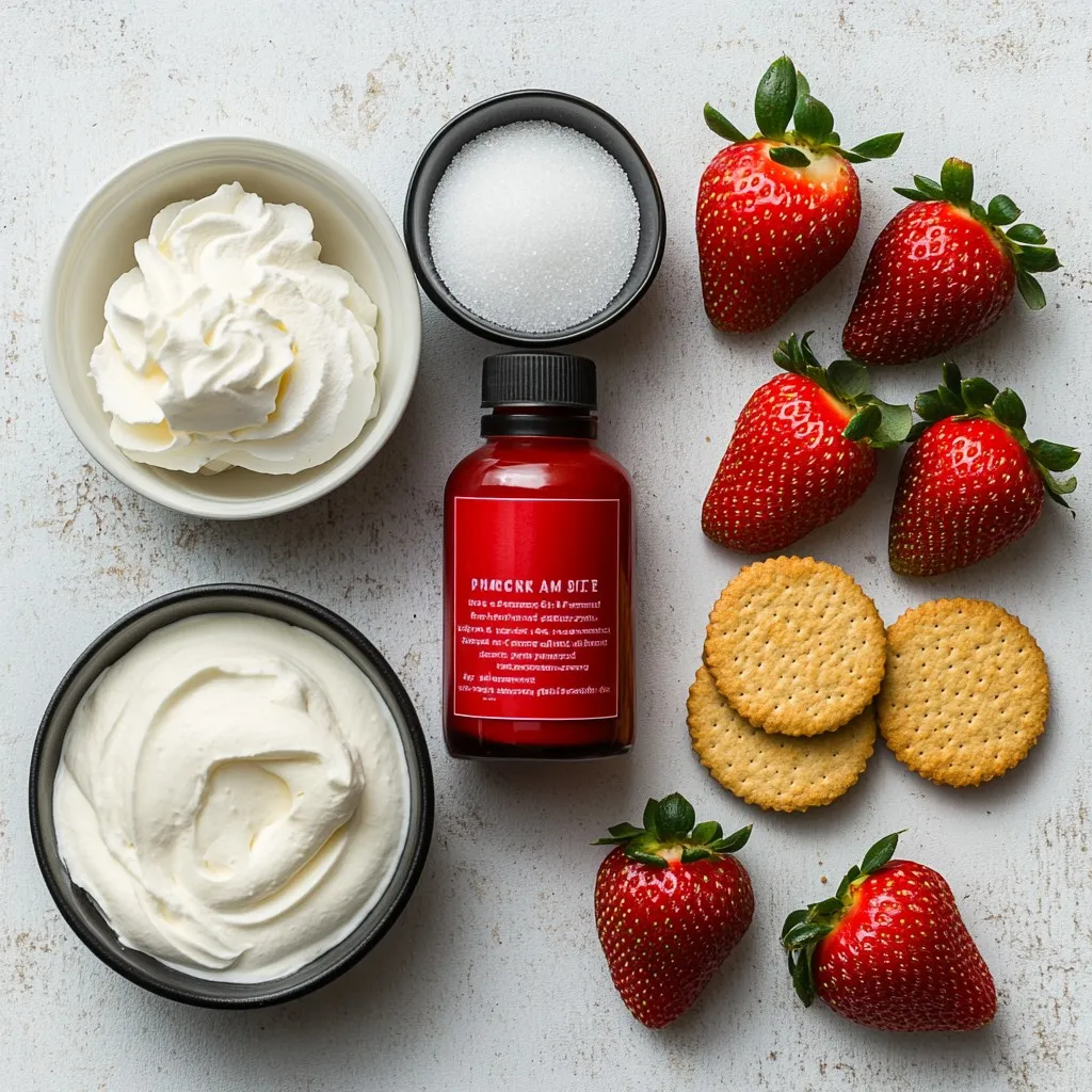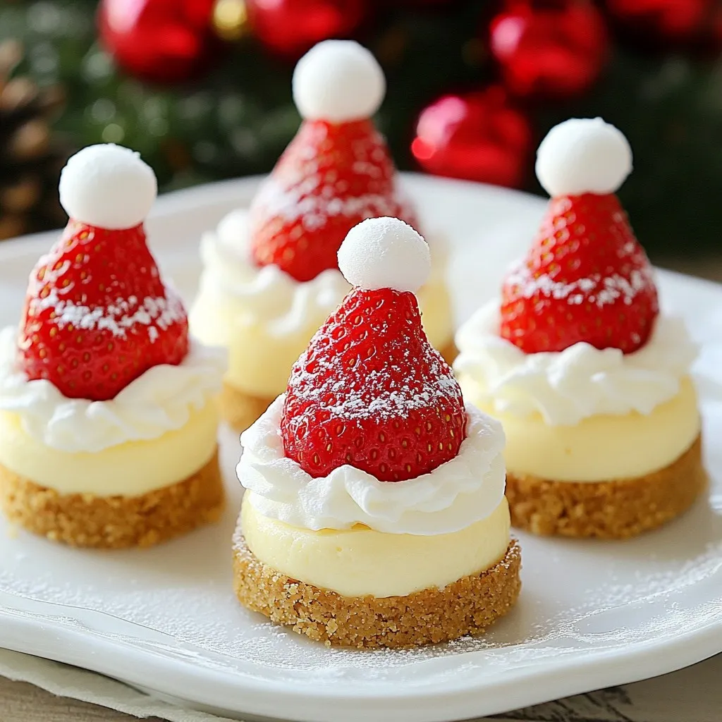 To create these Santa hat cheesecake bites, start with the cream cheese. It gives a rich, creamy base. The sugar adds sweetness, while the vanilla extract brings warmth. The whipped cream makes the filling light and fluffy. Mini graham cracker crusts hold the cheesecake and add crunch. Fresh strawberries act as the Santa hats, giving a festive look. Finally, the red frosting and powdered sugar add the perfect finishing touches.