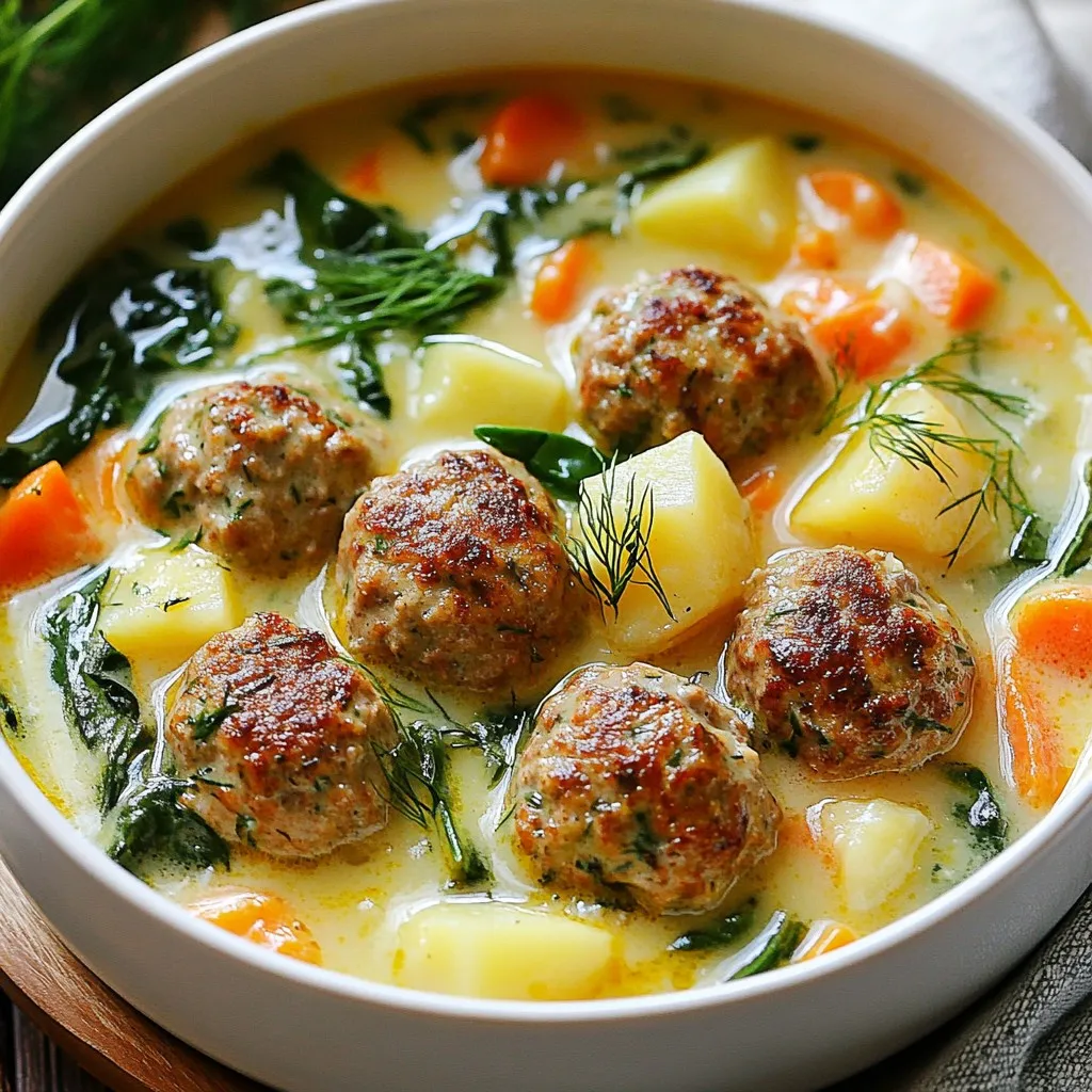 A hearty and comforting soup featuring meatballs made from ground beef and pork, served with vegetables and a creamy broth.