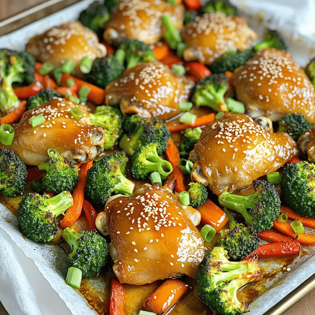 To make Sheet Pan Honey Garlic Chicken Veggies, you will need the following main ingredients: - 4 boneless, skinless chicken thighs - 1/4 cup honey - 3 tablespoons soy sauce - 3 cloves garlic, minced - 1 tablespoon fresh ginger, grated - 1 tablespoon olive oil - 1 teaspoon sesame oil - 2 cups broccoli florets - 1 red bell pepper, sliced - 1 cup carrots, sliced - Salt and pepper, to taste - 1 teaspoon crushed red pepper flakes (optional) - Sesame seeds, for garnish - Chopped green onions, for garnish These ingredients come together to create a sweet and savory dish. The chicken thighs provide rich flavor and juiciness. Honey adds sweetness that balances the salty soy sauce. Garlic and ginger bring a punch of flavor. The veggies add color and crunch to the meal. You can tweak the recipe by adding or changing vegetables based on your taste. Try snap peas or zucchini for a fresh twist. This recipe is simple, and you can have fun mixing up the ingredients to suit your family’s favorites. - Start by preheating your oven to 400°F (200°C). This makes sure the chicken cooks well. - Line a large baking sheet with parchment paper. This helps with easy cleanup later. - In a mixing bowl, whisk together the honey, soy sauce, minced garlic, and grated ginger. - Add olive oil, sesame oil, and red pepper flakes if you like some heat. Mix until everything is combined. - Season the chicken thighs with salt and pepper on both sides. This adds flavor to the meat. - Place the seasoned chicken on one side of the baking sheet. - Pour half of the honey garlic marinade over the chicken. Make sure it is well coated. - In another bowl, mix the broccoli, bell pepper, and carrot slices. Drizzle the rest of the marinade over the veggies. Toss them to coat evenly. - Spread the veggies on the other side of the baking sheet in a single layer. - Bake the dish in the oven for 25-30 minutes. Check that the chicken reaches an internal temperature of 165°F (75°C) and the veggies are tender-crisp. - Optional: Broil on high for 2-3 minutes to get a nice caramelization on the chicken and a bit of char on the veggies. Just watch closely to avoid burning. To make a great marinade, start with the right balance. You can adjust the sweetness by adding more honey or using less. If you want heat, add more crushed red pepper flakes. For a twist, try using tamari instead of soy sauce. This option works well for gluten-free diets. You can also swap in coconut aminos for a sweeter taste. When cooking, keep the chicken and veggies separate on the pan. This helps the heat reach each one equally. Make sure the chicken is not crowded. This way, it cooks better and gets a nice glaze. For tender-crisp veggies, keep an eye on the oven. Bake them until they are bright and firm but not mushy. Garnishes can make your dish pop. Use sesame seeds for a nice crunch and a nutty flavor. Chopped green onions add color and a fresh taste. For plating, arrange the chicken and veggies neatly. Place the chicken in the center and surround it with veggies. Drizzle some sauce on top for an extra touch. This makes your meal look as good as it tastes! {{image_2}} You can switch up the protein in this dish for a new twist. If you want a substitute for chicken thighs, try chicken breasts. They cook quickly and stay juicy with the honey garlic sauce. You can also use turkey thighs for a similar flavor. For a lighter option, consider using shrimp or salmon. Both cook fast and soak up the sauce well. If you prefer a plant-based choice, tofu is a great option. Choose firm tofu for a nice texture. Cut it into cubes, then marinate it just like chicken. Cook it the same way, ensuring it gets nice and crispy. You can play with the veggies in this recipe. Broccoli, bell peppers, and carrots bring great flavor and color. But feel free to swap them out! Zucchini, snap peas, and cauliflower all work well. You should also think about seasonal veggies. In the summer, use fresh corn or cherry tomatoes. In the fall, butternut squash or Brussels sprouts add warmth. Adjusting the veggies keeps your meals fresh and exciting. To boost flavor, try adding more spices and herbs. Fresh basil or cilantro can brighten the dish. You can also add a pinch of cumin or paprika for extra depth. Marinating the chicken or tofu longer adds even more flavor. If you have time, let it rest for a few hours, or even overnight. The longer it sits, the more the flavors meld. This step is simple but makes a big difference! To store leftovers, place the chicken and veggies in an airtight container. Make sure they cool to room temperature before sealing. This helps keep them fresh and safe to eat. In the fridge, your dish lasts up to three days. If you want to eat it later, consider freezing it instead. For reheating, the oven is best. Preheat it to 350°F (175°C). Place the chicken and veggies on a baking sheet. Heat for about 15-20 minutes or until warm. You can also use a microwave, but it may change the texture. Cover the dish with a damp paper towel to keep moisture in. You can freeze this dish before or after cooking. If freezing raw, marinate the chicken and veggies, then place them in a freezer-safe bag. It can stay good for up to three months. To cook, thaw overnight in the fridge before baking. If freezing after cooking, let it cool completely. Wrap it tightly and store it. To enjoy, thaw and reheat as mentioned above. Yes, you can use bone-in chicken. Bone-in chicken will add more flavor. Just be aware it may take longer to cook. Make sure it reaches 165°F for safety. Adjust cooking time based on the size of the pieces. You can try teriyaki sauce or sweet chili sauce. Barbecue sauce also works well for a smoky flavor. A simple mix of soy sauce and citrus juice adds brightness. Experiment with flavors that you enjoy. Use skinless chicken breast instead of thighs. Swap honey for a sugar-free sweetener if needed. Add more veggies like zucchini or snap peas. You can also use less oil in the marina
