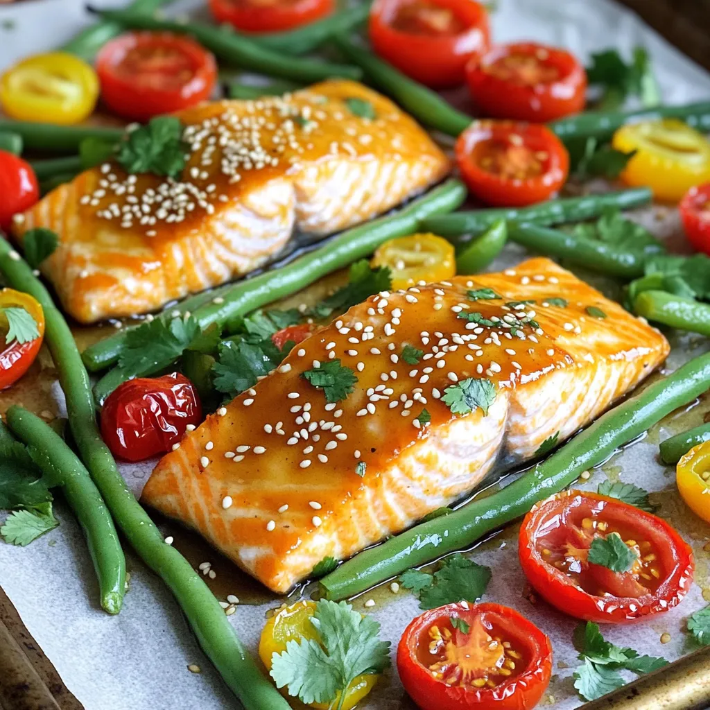 Now it’s time to marinate the salmon. Place 4 salmon fillets on one side of the baking sheet. Brush half of your marinade over the salmon. Make sure each fillet gets a nice coat. On the other side, add 2 cups of green beans, 1 sliced red bell pepper, and 1 cup of halved cherry tomatoes. Drizzle the rest of the marinade over the veggies. Toss them gently to coat every piece. This adds flavor to your side dish.