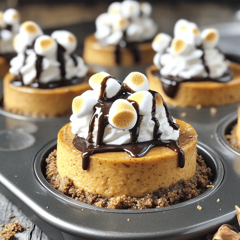Now, pour the pumpkin cheesecake mixture over the crusts in the muffin tin. Fill each cup about three-quarters full. Place the muffin tin in the oven and bake for about 25 to 30 minutes. The filling should set and have a slight jiggle in the center. After baking, sprinkle mini marshmallows on top. Return the tin to the oven for an extra 2 to 3 minutes. The marshmallows should turn golden and gooey.