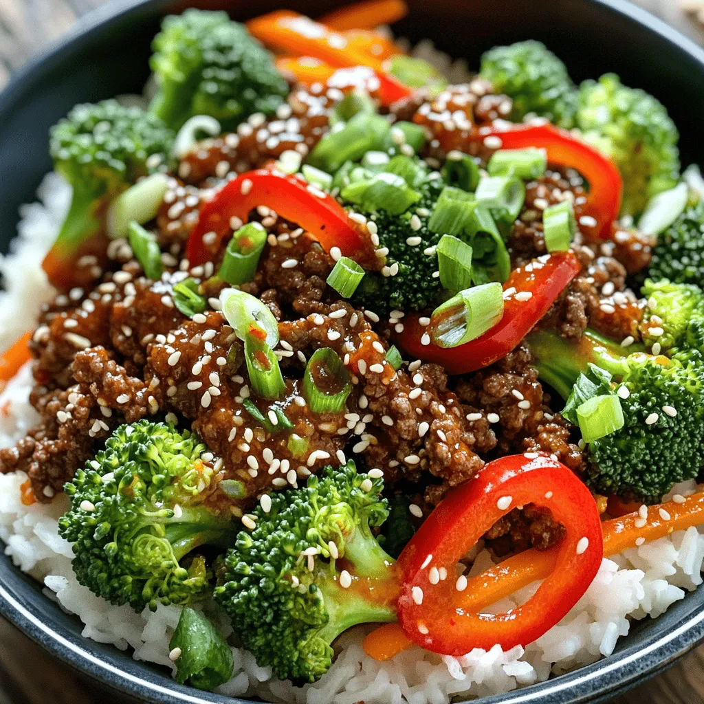 ![To make Spicy Korean Beef Bowls, you will need the following ingredients: - 1 lb (450g) ground beef - 2 cloves garlic, minced - 1 teaspoon ginger, grated - 3 tablespoons soy sauce - 2 tablespoons gochujang (Korean chili paste) - 1 tablespoon sesame oil - 1 tablespoon brown sugar - 1 cup broccoli florets - 1 carrot, julienned - 1 red bell pepper, sliced - 2 green onions, chopped - Cooked rice (white or brown, for serving) - Sesame seeds, for garnish - Optional: Kimchi, for serving These ingredients combine to create a dish that is spicy, savory, and full of flavor. The ground beef serves as a hearty base, while the gochujang adds heat and depth. Fresh veggies like broccoli, carrot, and bell pepper give color and crunch. You can adjust some ingredients based on your taste. For example, if you prefer less spice, use less gochujang. If you want more crunch, you can add more vegetables. These ingredients are easy to find in most grocery stores. You can also explore local markets for fresher options. Check out the Full Recipe for step-by-step instructions on how to put it all together. - Heat the sesame oil in a skillet. Start by pouring the sesame oil into a large skillet. Set the heat to medium-high. - Sauté garlic and ginger. Next, add the minced garlic and grated ginger. Cook them for about one minute. You want them to smell amazing. - Cook the ground beef. Increase the heat to high and add the ground beef. Cook it for about five to seven minutes. Break it up into smaller pieces as it cooks. - Mix soy sauce, gochujang, and brown sugar. In a small bowl, combine the soy sauce, gochujang, and brown sugar. Stir this well until the sugar dissolves. - Add to the cooked beef. Pour your sauce mixture over the cooked beef. Stir the beef until it is well coated. - Incorporate vegetables. Now, add the broccoli, carrots, and red bell pepper. Cook this for another three to four minutes. You want the veggies to be tender, but still crisp. - Spoon rice into bowls. Grab your cooked rice and spoon it into serving bowls. - Top with the beef and vegetable mixture. Now, add the spicy beef and veggie mix on top of the rice. - Garnish and add optional sides. Sprinkle sesame seeds over the bowl. If you like, add kimchi on the side for extra flavor. For the full recipe, check out [Full Recipe]. Enjoy your meal! To make your Spicy Korean Beef Bowls shine, start with high-quality gochujang. This Korean chili paste adds depth and heat. It has a unique flavor that makes the dish pop. Look for brands that use natural ingredients. A good gochujang will elevate your meal. Balancing spice levels is key. If you want a milder taste, use less gochujang. You can add more sugar to balance the heat. On the other hand, if you love spice, feel free to add more. Taste as you go and adjust to your liking. Browning ground beef well is essential. Use a large skillet and heat it over high heat. This helps achieve a nice brown color. Break the meat into smaller pieces while it cooks. This allows for even cooking and flavor absorption. For tender-crisp vegetables, don’t overcook them. Add broccoli, carrots, and bell peppers toward the end of cooking. Stir-fry them for just a few minutes. This keeps the veggies bright and crunchy, adding great texture. For a complete meal, pair your beef bowls with side dishes like kimchi or pickled vegetables. They add tangy flavors that complement the heat. You can also serve it with steamed edamame or a simple cucumber salad. Garnishes can enhance the dish too. Sprinkle sesame seeds on top for crunch. Chopped green onions add freshness. You can also drizzle extra sesame oil for a rich flavor. Feel free to get creative with your toppings! {{image_2}} You can easily swap out the proteins in this dish. Instead of ground beef, try ground chicken or turkey. For a meat-free option, use firm tofu. Just crumble it into the skillet for a great texture. Vegetable substitutions can also enhance this recipe. If you don't have broccoli, use snap peas or green beans. Instead of red bell pepper, try yellow or orange peppers. Feel free to mix in your favorite veggies for added color and nutrients. To make a milder version, reduce the gochujang. You can start with just one tablespoon and taste as you go. Adding a bit of brown sugar can help balance the heat too. If you want extra spice, add more gochujang or a sprinkle of red pepper flakes. A dash of hot sauce when serving can also kick things up a notch. Just remember, you can always add more heat, but it’s hard to take it away! You can serve this dish in fun ways. For a fresh twist, make lettuce wraps. Just spoon the spicy beef mixture into large lettuce leaves and roll them up. This adds crunch and is great for a low-carb option. Another idea is to turn it into noodle bowls. Use your favorite noodles, like rice noodles or soba. Simply lay the noodles in a bowl, top with the spicy beef and veggies, and enjoy. Each bite will be a delicious blend of flavors. For the full recipe, check the original ingredients and steps. To store leftover Spicy Korean Beef Bowls, let them cool first. Place the beef and veggies in an airtight container. Make sure to cover it tightly. In the fridge, these bowls last about 3 to 4 days. If you want to keep them fresh longer, consider freezing. You can freeze the cooked beef mixture. Just place it in a freezer-safe container or a zip-top bag. Remove as much air as you can. This helps prevent freezer burn. The beef will stay good for up to 3 months. When you're ready to eat, thaw it overnight in the fridge. Reheat it in a skillet or microwave until hot. Preparing ingredients in advance can save time. Chop the veggies and store them in separate containers. You can also mix the sauce and keep it in the fridge. When you want a quick meal, just cook the beef, add the prepped veggies, and mix in the sauce. This way, you can enjoy a tasty dish in no time. You can find the Full Recipe above to guide you. How long does it take to cook Spicy 