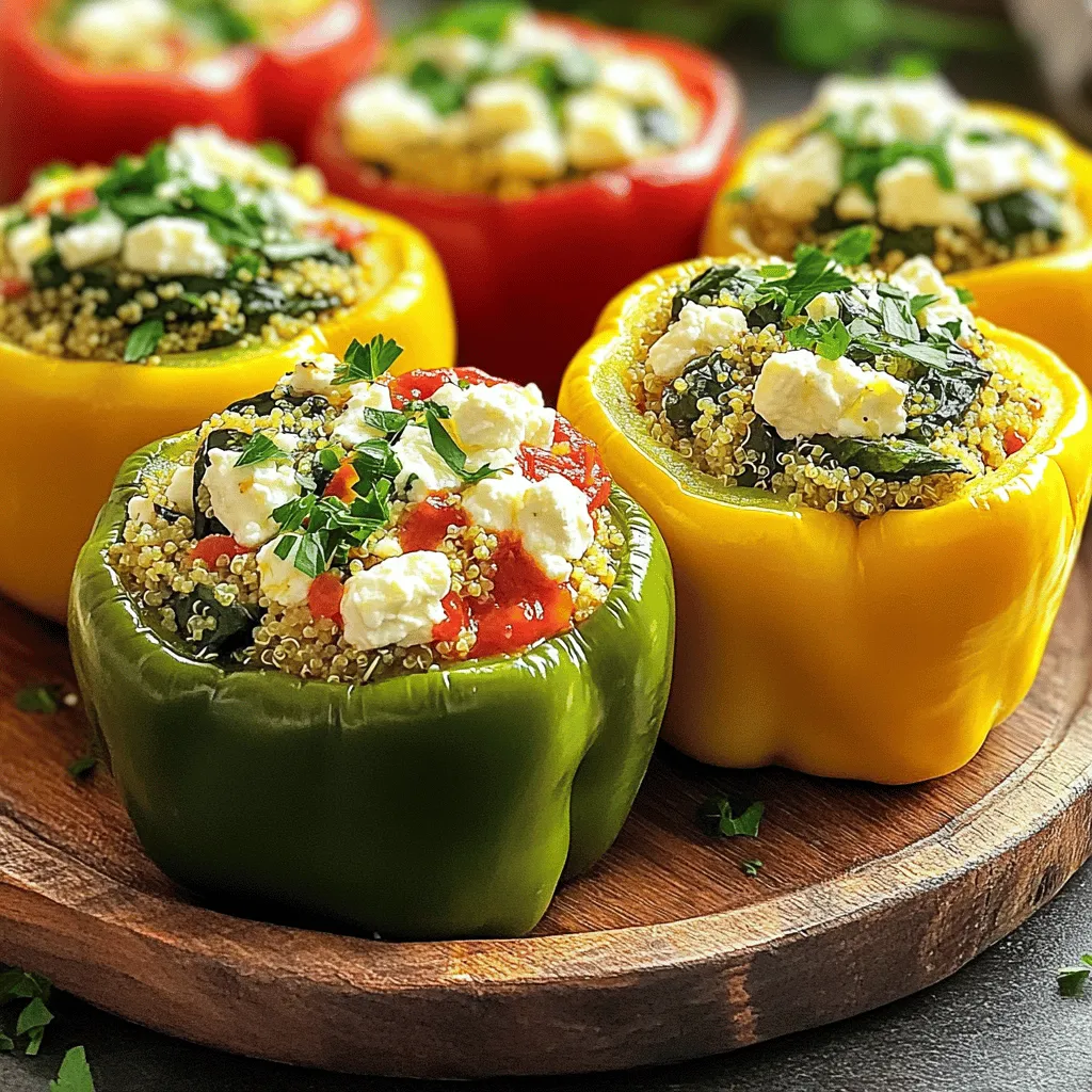 - 4 large bell peppers (any color) - 2 cups fresh spinach, chopped - 1 cup feta cheese, crumbled - 1 cup cooked quinoa (or rice) - 1 small onion, finely chopped - 2 cloves garlic, minced - 1 teaspoon dried oregano - 1 teaspoon olive oil - Salt and pepper to taste - ½ cup marinara sauce (optional) - Fresh parsley, chopped (for garnish) When I make spinach feta stuffed peppers, I love to gather fresh ingredients. You can use any color bell peppers, like red, yellow, or green. They add a nice touch to the dish. The star of this recipe is the fresh spinach. I always chop it finely for even mixing. Feta cheese gives a nice salty flavor, which pairs well with the spinach. Cooked quinoa or rice works well as a base. Quinoa adds protein, making the dish more filling. You can add a small onion and minced garlic for extra flavor. Dried oregano adds an herbal touch that brightens the taste. I use a little olive oil to sauté the onion and garlic until soft. Salt and pepper bring all the flavors together. If you like, you can use marinara sauce for a tangy twist. Finally, fresh parsley makes a great garnish. It adds color and freshness to your plate. You can add other ingredients to make your stuffed peppers unique. Consider adding chopped tomatoes or olives for extra flavor. If you like a bit of heat, diced jalapeños can spice things up. If you're gluten-free, make sure to use rice instead of quinoa. You can also swap feta for a dairy-free cheese if needed. For a lower-carb option, try using cauliflower rice instead of quinoa or rice. 1. Preheat your oven to 375°F (190°C). This makes sure your peppers cook well. 2. Prepare the bell peppers. Cut off the tops and remove seeds and membranes. Set them aside. This step keeps the peppers firm and ready for stuffing. 3. Sauté onions and spinach. In a skillet, heat 1 teaspoon of olive oil over medium heat. Add 1 small finely chopped onion. Cook for 3-4 minutes until it looks clear. 4. Add 2 minced garlic cloves and 2 cups of chopped spinach to the skillet. Cook until the spinach wilts, about 2-3 minutes. This mix adds great flavor to your dish. 1. Combine ingredients in a bowl. In a large bowl, mix the sautéed onions and spinach with 1 cup of cooked quinoa, 1 cup of crumbled feta cheese, and 1 teaspoon of dried oregano. Season with salt and pepper. Make sure to blend well. 2. Pack the mixture into peppers. Stuff each bell pepper with the spinach and feta mixture. Press down gently to pack it in. This ensures every bite is full of flavor. 1. Baking instructions and time. If you like, spread ½ cup of marinara sauce at the bottom of a baking dish. Place the stuffed peppers upright. Drizzle more sauce on top if you want. Cover the dish with foil and bake for 25 minutes. 2. Tips for checking pepper tenderness. After 25 minutes, remove the foil. Bake for another 10 minutes. Check if the peppers are soft by poking them with a fork. If they are tender, they are ready to serve. - Suggested spices and herbs: You can boost the taste with more herbs. Try adding basil or thyme. A pinch of red pepper flakes adds heat. For a zing, use lemon zest. - Incorporating additional vegetables: Feel free to add chopped mushrooms, zucchini, or carrots. They add texture and nutrition. Just sauté them with the onions and garlic. Make sure to cook the quinoa or rice properly. This keeps the filling light and fluffy. When stuffing the peppers, pack the mixture gently. This helps them cook evenly. Covering with foil while baking keeps moisture in. Remove the foil later for a slightly crispy top. Serve the stuffed peppers on a colorful platter. A drizzle of marinara sauce adds a nice touch. Garnish with fresh parsley for a pop of color. Pair them with a simple side salad for a balanced meal. {{image_2}} You can easily make this dish vegetarian or vegan. For a vegetarian meal, simply keep the feta cheese. If you want it vegan, swap feta for tofu or a nut-based cheese. Both options keep the flavor rich and delicious. Adding more veggies like mushrooms or zucchini can boost nutrition too. Feel free to change the grain. Quinoa is great, but rice, barley, or farro work well too. Each grain brings a unique taste and texture. When it comes to cheese, try goat cheese or a dairy-free option. These choices add a twist to the classic flavor. Boost the Mediterranean vibe by adding olives or sun-dried tomatoes. These ingredients add saltiness and depth to the dish. You can also sprinkle fresh herbs like basil or mint on top. These additions can make your stuffed peppers even more vibrant and tasty. To store your leftover spinach feta stuffed peppers, let them cool first. Place them in an airtight container. You can keep them in the fridge for up to four days. If you want to enjoy them later, separate the filling from the peppers to keep them fresh longer. This helps prevent sogginess. When you're ready to eat your leftovers, preheat your oven to 350°F (175°C). Place the peppers in a baking dish. Cover with foil to keep them moist. Heat for about 15-20 minutes or until they are warm throughout. You can also use a microwave, but the oven keeps the peppers from getting too soft. You can freeze spinach feta stuffed peppers for up to three months. To freeze, wrap each pepper in plastic wrap and then place them in a freezer bag. When you want to eat them, thaw in the fridge overnight. Then, bake them at 350°F (175°C) until heated through. This keeps the flavors and textures nice. Yes, you can make spinach feta stuffed peppers ahead of time. Prepare the filling and stuff the peppers. Store them in the fridge for up to 24 hours. When you are ready to bake, just pop them in the oven. This saves time and makes a quick meal. Stuffed peppers pair well with many sides. Here are some great options: - A simple green salad with lemon vinaigrette. - Garlic bread for a crunchy bite. - Steamed vegetables like broccoli or green beans. - A side of quinoa or rice. These sides add color and nutrients to your me