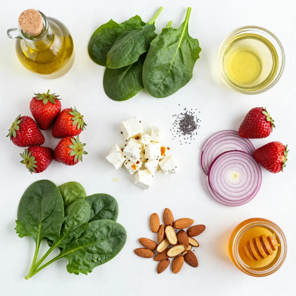 For a lively salad, I love using fresh ingredients. Baby spinach adds a nice crunch and bright color. Strawberries bring sweetness and a pop of red. The red onion offers a sharp bite. Crumbled feta cheese gives a creamy texture. Slivered almonds add crunch and nutty flavor.