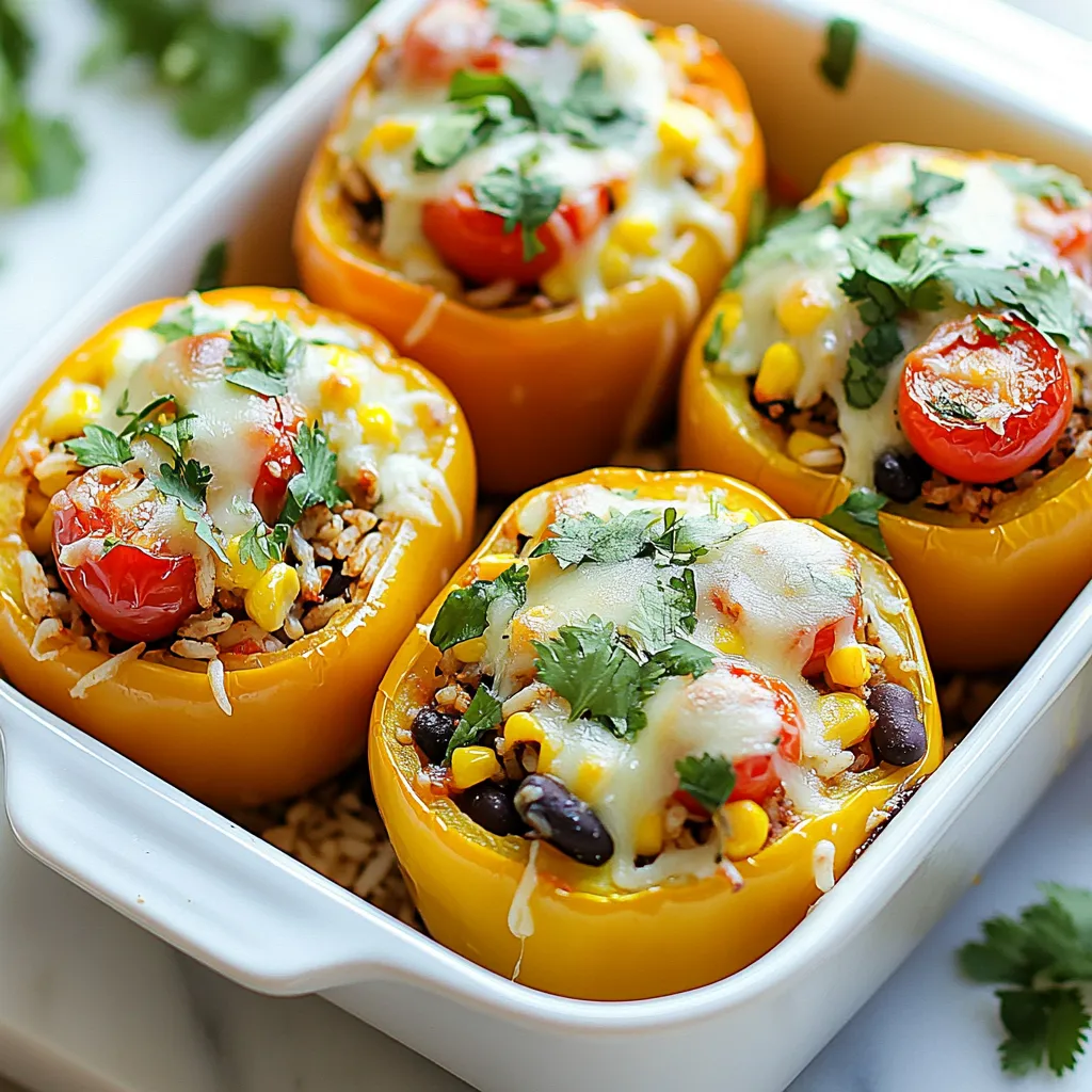 Delicious bell peppers filled with a colorful mixture of brown rice, black beans, corn, and cheese.