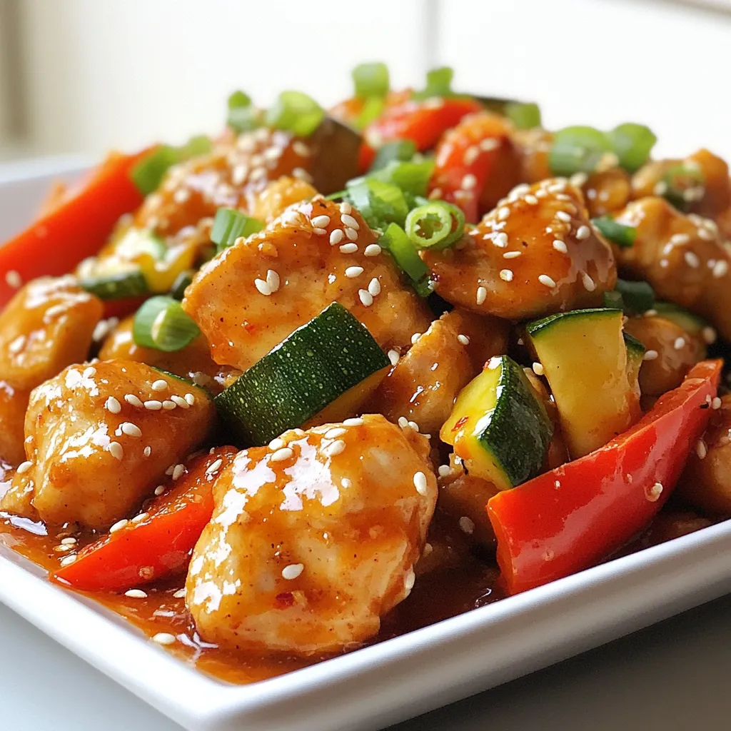 - 1 lb (450g) boneless chicken thighs, cut into bite-sized pieces - 1/2 cup sweet chili sauce - 2 tablespoons soy sauce - 1 tablespoon rice vinegar - 1 tablespoon honey - 2 garlic cloves, minced - 1 teaspoon fresh ginger, grated - 1 bell pepper (red or yellow), sliced - 1 small zucchini, sliced - 1 tablespoon vegetable oil - 1 teaspoon sesame oil - Salt and pepper to taste - 2 green onions, chopped (for garnish) - Sesame seeds (for garnish) When choosing chicken, look for bright pink meat. It should feel firm to the touch. For bell peppers, pick ones with smooth skin and vibrant color. Zucchini should be firm, not soft. Fresh garlic should smell strong and have tight skins. Always check the date on sauces to ensure freshness. If you can’t find chicken thighs, use boneless chicken breasts. They work well too. Instead of sweet chili sauce, try teriyaki sauce for a different taste. If you're out of rice vinegar, apple cider vinegar is a good swap. For a healthier option, use agave syrup instead of honey. {{ingredient_image_1}} First, gather all your ingredients. You will need boneless chicken thighs, sweet chili sauce, soy sauce, rice vinegar, honey, garlic, ginger, bell pepper, zucchini, vegetable oil, sesame oil, salt, pepper, green onions, and sesame seeds. This recipe takes about 40 minutes from start to finish. In a large bowl, mix the sweet chili sauce, soy sauce, rice vinegar, honey, minced garlic, and grated ginger. This mix gives the chicken lots of flavor. Now, add the chicken pieces and toss well to coat every piece. Cover the bowl and let it marinate for at least 30 minutes. If you have time, let it sit overnight in the fridge. This makes the chicken even tastier. Heat the vegetable oil in a large skillet or wok over medium-high heat. Once hot, add the chicken, discarding any extra marinade. Stir-fry the chicken for about 5 to 7 minutes. Look for a golden brown color and ensure it’s fully cooked. Next, add the sliced bell pepper and zucchini. Continue to stir-fry for another 3 to 4 minutes, until the veggies are tender but still a bit crisp. Drizzle sesame oil over the chicken and veggies, then season with salt and pepper. Mix everything well and remove it from the heat. Transfer your Sweet Chili Chicken to a serving dish and garnish with chopped green onions and sesame seeds. Enjoy this delicious meal with family or friends! To get the best sauce on your chicken, start with a good marinade. Mix sweet chili sauce, soy sauce, rice vinegar, honey, garlic, and ginger well. Marinate the chicken for at least 30 minutes. This helps the flavors soak in. For even more taste, marinate overnight. After cooking, drizzle some sesame oil over the dish to enhance the flavor. Using the right tools makes cooking easier. Here’s what I recommend: - A large mixing bowl for marinating the chicken. - A large skillet or wok for stir-frying. - A spatula for flipping and mixing. - A sharp knife for slicing vegetables. - Measuring cups and spoons for accuracy. These tools help you cook like a pro. Avoid these common mistakes when making sweet chili chicken: - Don’t skip marinating. It adds lots of flavor. - Make sure your skillet is hot before adding the chicken. This helps it cook evenly. - Don’t crowd the pan. Cook in batches if needed. This keeps the chicken from steaming and helps it brown. - Lastly, be careful not to overcook the chicken. It should be juicy, not dry. By following these tips, you’ll create a delicious sweet chili chicken every time! Pro Tips Marinate for Maximum Flavor: For the best taste, marinate the chicken overnight. This allows the flavors to penetrate deeply into the meat. Use Fresh Ingredients: Fresh garlic and ginger will enhance the flavor profile significantly. Try to avoid pre-minced or jarred options. Customize Your Veggies: Feel free to substitute or add other vegetables like broccoli or snap peas based on your preference or what you have on hand. Adjust the Heat: If you like a bit of spice, add some red pepper flakes or sliced fresh chili to the stir-fry for an extra kick. {{image_2}} You can easily add more veggies for color and nutrition. Bell peppers and zucchini work great. Just slice them up and toss them in during cooking. This addition makes your dish look vibrant. It also adds crunch and flavor. Stir-fry the veggies for just a few minutes. This way, they stay crisp and fresh. You can use other veggies like broccoli or snap peas too. They all go well with sweet chili sauce. If you love heat, try adding chili flakes or fresh chilies. This will kick your dish up a notch. Mix them in with the marinade for a spicy blend. You can also add sriracha sauce for an extra kick. Adjust the heat level to your taste. Remember, a little goes a long way! This spicy twist offers a new flavor that many will enjoy. If you need a gluten-free meal, choose gluten-free soy sauce. Many brands offer this option, so it’s easy to find. Just swap it in for regular soy sauce in the recipe. You can also check the sweet chili sauce label. Some brands contain gluten. Select a gluten-free version to keep your dish safe. By making these small changes, you can enjoy sweet chili chicken without worry. To keep your sweet chili chicken fresh, let it cool first. Place it in an airtight container. Store it in the fridge for up to three days. This way, you keep the flavors intact. If you want to keep it longer, consider freezing it. When you are ready to enjoy your leftovers, simply reheat them. You can use the microwave or a skillet. If using a microwave, heat for 1-2 minutes. Stir halfway to ensure even warmth. If using a skillet, add a splash of water to keep it moist. Heat over medium until hot. To freeze sweet chili chicken, pack it in a freezer-safe container. Make sure to remove as much air as possible. It can last up to three months in the freezer. When ready, thaw it overnight in the fridge before reheating. This keeps the dish tasty and safe to eat. You can pair Sweet Chili Chic