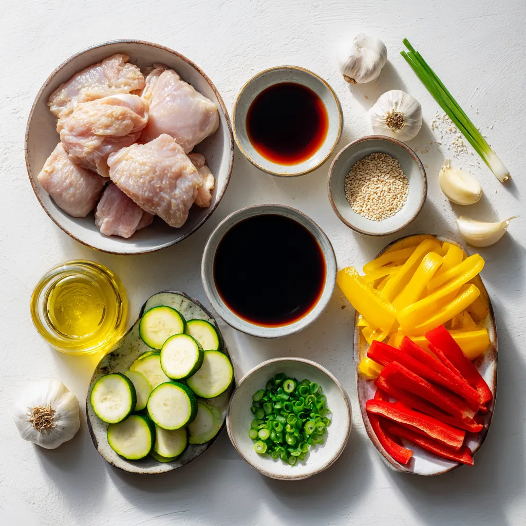 First, gather all your ingredients. You will need boneless chicken thighs, sweet chili sauce, soy sauce, rice vinegar, honey, garlic, ginger, bell pepper, zucchini, vegetable oil, sesame oil, salt, pepper, green onions, and sesame seeds. This recipe takes about 40 minutes from start to finish.