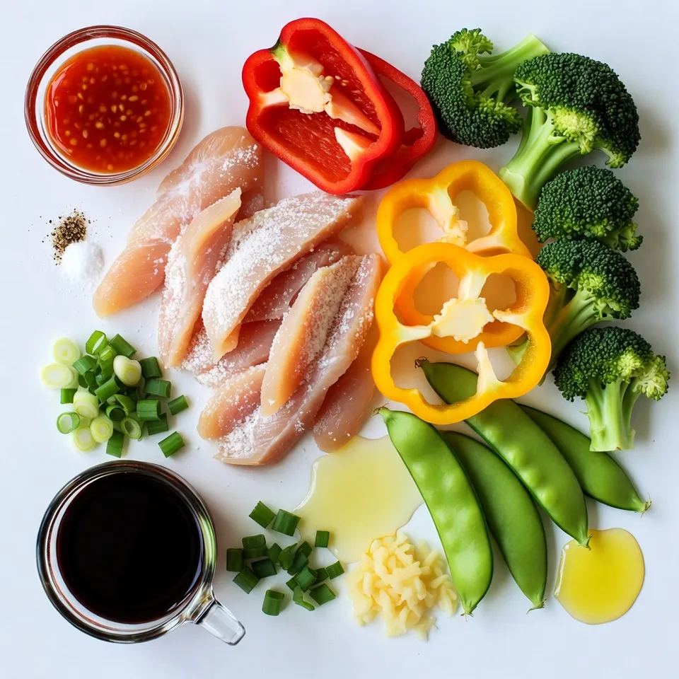 - 1 lb boneless, skinless chicken breast - 1 red bell pepper - 1 yellow bell pepper - 1 cup broccoli florets - 1 cup sugar snap peas The star of this dish is the chicken. I like to slice it into thin strips. This helps it cook quickly and soak up flavors. Fresh vegetables add color and crunch. Bell peppers bring sweetness, while broccoli and sugar snap peas add a crisp texture. - 1/4 cup sweet chili sauce - 1 tablespoon soy sauce - 1 teaspoon sesame oil The sweet chili sauce gives this stir fry its name. It adds a sweet and spicy taste. Soy sauce brings umami, while sesame oil adds a nutty flavor. Together, they create a sauce that coats the chicken and veggies perfectly. - 2 tablespoons cornstarch - 2 tablespoons vegetable oil - 3 cloves garlic - 1 tablespoon fresh ginger Cornstarch helps to make the chicken crispy. It coats the chicken well before cooking. Vegetable oil is great for frying. I always use garlic and ginger for extra flavor. They add depth and warmth to the dish. {{ingredient_image_1}} - Start by taking 1 pound of boneless, skinless chicken breast. Slice it into thin strips. - Place the chicken in a large bowl and sprinkle it with 2 tablespoons of cornstarch. - Toss the chicken well to coat each piece evenly. This step adds a tasty crust when cooked. - Heat 1 tablespoon of vegetable oil in a large skillet over medium-high heat. - Add the chicken to the hot skillet. Cook it for about 5 to 7 minutes. - Make sure the chicken turns a nice golden brown and is cooked through. - Once done, remove the chicken from the pan and set it aside. - In the same skillet, add another tablespoon of vegetable oil. - Toss in 3 cloves of minced garlic and 1 tablespoon of minced ginger. Sauté for about 30 seconds. - This step makes your kitchen smell amazing! - Next, add 1 sliced red bell pepper, 1 sliced yellow bell pepper, 1 cup of broccoli florets, and 1 cup of sugar snap peas. - Stir-fry the veggies for 4 to 5 minutes. You want them tender but still crisp. - Return the cooked chicken to the skillet. - Pour in 1/4 cup of sweet chili sauce, 1 tablespoon of soy sauce, and 1 teaspoon of sesame oil. - Toss everything together until all the ingredients are well coated. - Cook for an additional 2 to 3 minutes to heat everything through. - Finally, season with salt and pepper to taste before removing from heat. To cook the chicken just right, aim for a golden brown color. This usually takes about 5 to 7 minutes on medium-high heat. Make sure to stir it often for even cooking. For vegetables, keep them crunchy. Stir-fry them for only 4 to 5 minutes. This helps them stay bright and tasty. Remember, you want that tender-crisp texture. Serve your sweet chili chicken stir fry over fluffy jasmine rice. The rice soaks up the sauce, making each bite delightful. You can garnish the dish with chopped green onions and sesame seeds. This adds a nice touch of color and flavor. A sprinkle of fresh herbs can also elevate the look. Use a large skillet or wok for the best stir-fry results. A non-stick surface helps prevent sticking and makes cleaning easier. For prep, a sharp knife and a cutting board are essential. They help you chop ingredients quickly and safely. A sturdy spatula is also a must for tossing everything together. Pro Tips Coat Chicken Evenly: Make sure to coat the chicken strips evenly with cornstarch to achieve that crispy texture when they are cooked. High Heat for Stir Fry: Use high heat while cooking to quickly sear the ingredients, preserving their color and crunch for a perfect stir-fry. Fresh Ingredients Matter: Opt for fresh vegetables and herbs for the best flavor and nutritional value in your stir fry. Customize Your Sauce: Feel free to adjust the sweetness or spiciness of the sweet chili sauce to suit your taste preferences. {{image_2}} You can switch the chicken for beef or tofu in this dish. If you choose beef, use flank steak or sirloin. Slice it thin to keep it tender. Tofu is a great veggie option. Press it to remove extra water and cut it into cubes. When using beef, cook it for about 3-5 minutes. It cooks faster than chicken. For tofu, stir-fry it for about 4-6 minutes until it’s golden. Adjust cooking times to make sure all proteins are safe to eat. Feel free to swap in any veggies you have on hand. Carrots, zucchini, or snap peas work well. Think about seasonal vegetables, too. Fresh asparagus, baby corn, or bok choy are tasty choices in spring. Make sure to cut your veggies into similar sizes for even cooking. This helps them stay crisp and colorful in your stir fry. Want it spicier? Add sliced jalapeños or a splash of hot sauce. You can also sprinkle in some red pepper flakes. If you prefer a milder dish, cut back on the sweet chili sauce. You could also mix in a little extra soy sauce to balance the heat. Always taste as you go to find your perfect spice level! To keep your Sweet Chili Chicken Stir Fry fresh, place it in an airtight container. This helps lock in flavors and moisture. I recommend refrigerating it within two hours of cooking. Properly stored, it lasts about three to four days in the fridge. Reheat your stir fry gently to maintain taste and texture. The stovetop is best for this. Heat a non-stick skillet over medium heat, then add the stir fry. Stir occasionally until it’s hot. Avoid using the microwave, as it can make the veggies mushy. If you must use the microwave, heat in short bursts and stir in between. Yes, you can freeze Sweet Chili Chicken Stir Fry! Use a freezer-safe container or bag. Make sure to let it cool completely before freezing. This will help prevent ice crystals. It’s best if used within three months. To thaw, place it in the fridge overnight. Reheat on the stovetop for the best results. You can easily make Sweet Chili Chicken Stir Fry gluten-free. - Substitutes for soy sauce: Use tamari instead. Tamari is a gluten-free soy sauce alternative. You can also try coconut aminos. This option is soy-free and has a mild flavor. - Other glute