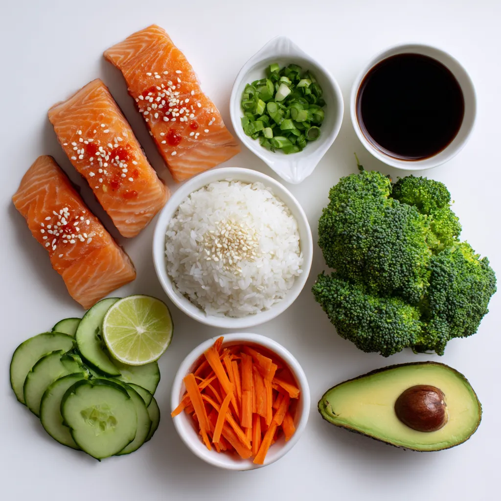 When you gather the ingredients, focus on freshness. The salmon should be bright and firm. Look for sweet chili sauce with a good balance of sweetness and heat. Jasmine rice adds a nice aroma and texture. Fresh veggies like broccoli and cucumber give crunch and color. Avocado adds creaminess, while lime brightens the dish.