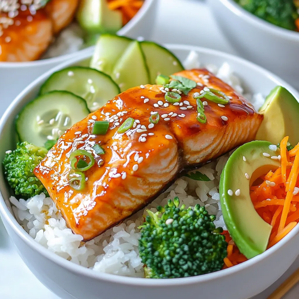A delicious and vibrant bowl featuring marinated salmon, fresh vegetables, and jasmine rice, topped with a sweet chili sauce.