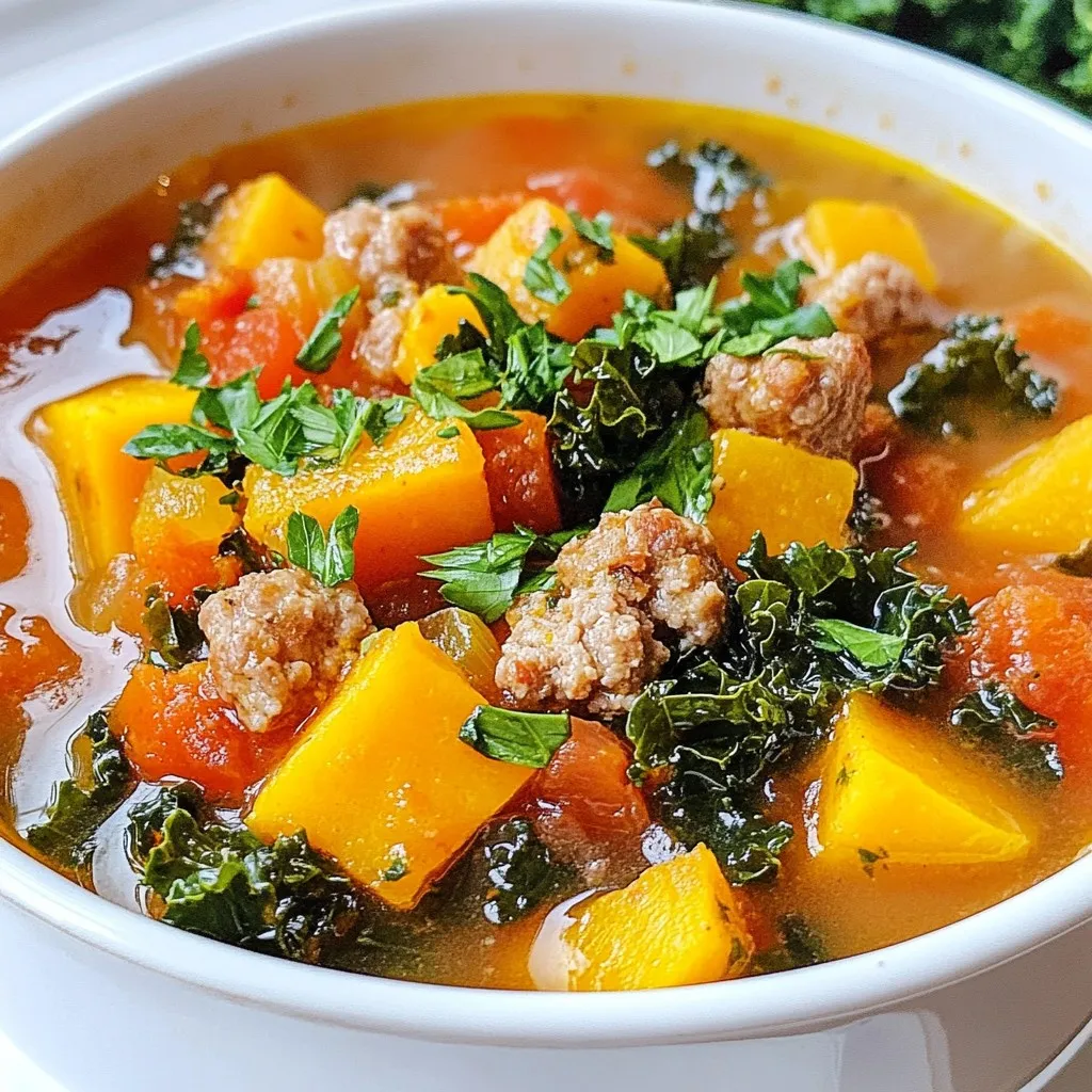 A hearty and flavorful soup made with sweet potatoes, sausage, and kale.