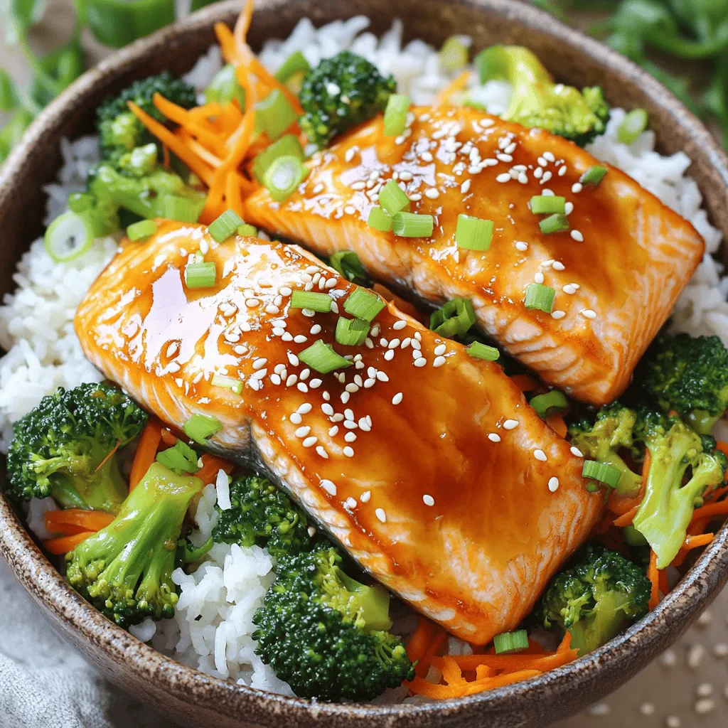 The ingredients for teriyaki salmon rice bowls are simple yet delightful. You start with salmon fillets, which give a rich, buttery taste. The teriyaki sauce adds a sweet and savory kick. Honey enhances that sweetness, bringing balance to the dish. Don’t forget to season with salt and pepper, which highlights all the flavors.