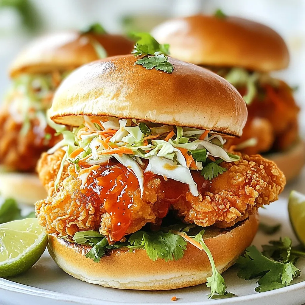 Soft brioche buns are perfect for this sandwich. They soak up the sauce without getting soggy. Shredded cabbage adds crunch. Fresh cilantro gives a bright flavor. Thai sweet chili sauce is a must for sweetness and spice. Serve with lime wedges for extra zest.