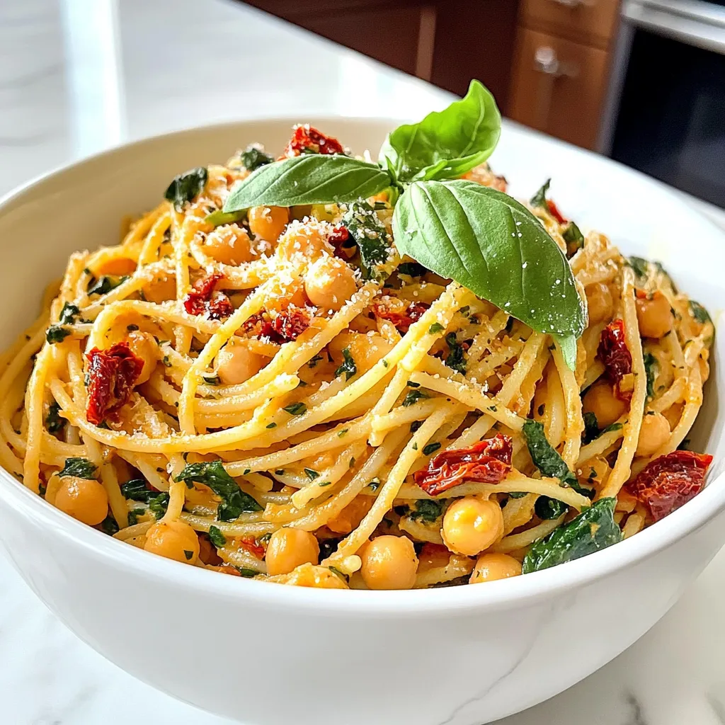 A delicious and healthy pasta dish featuring sun-dried tomatoes, chickpeas, and fresh spinach, perfect for a quick meal.