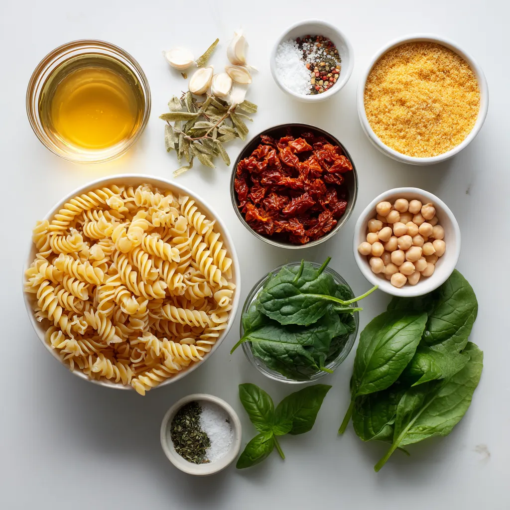 Each ingredient plays a key role in building flavors. The whole grain pasta gives a hearty base. The sun-dried tomatoes add a sweet and tangy depth. Chickpeas bring protein and texture, while fresh spinach adds color and nutrients.