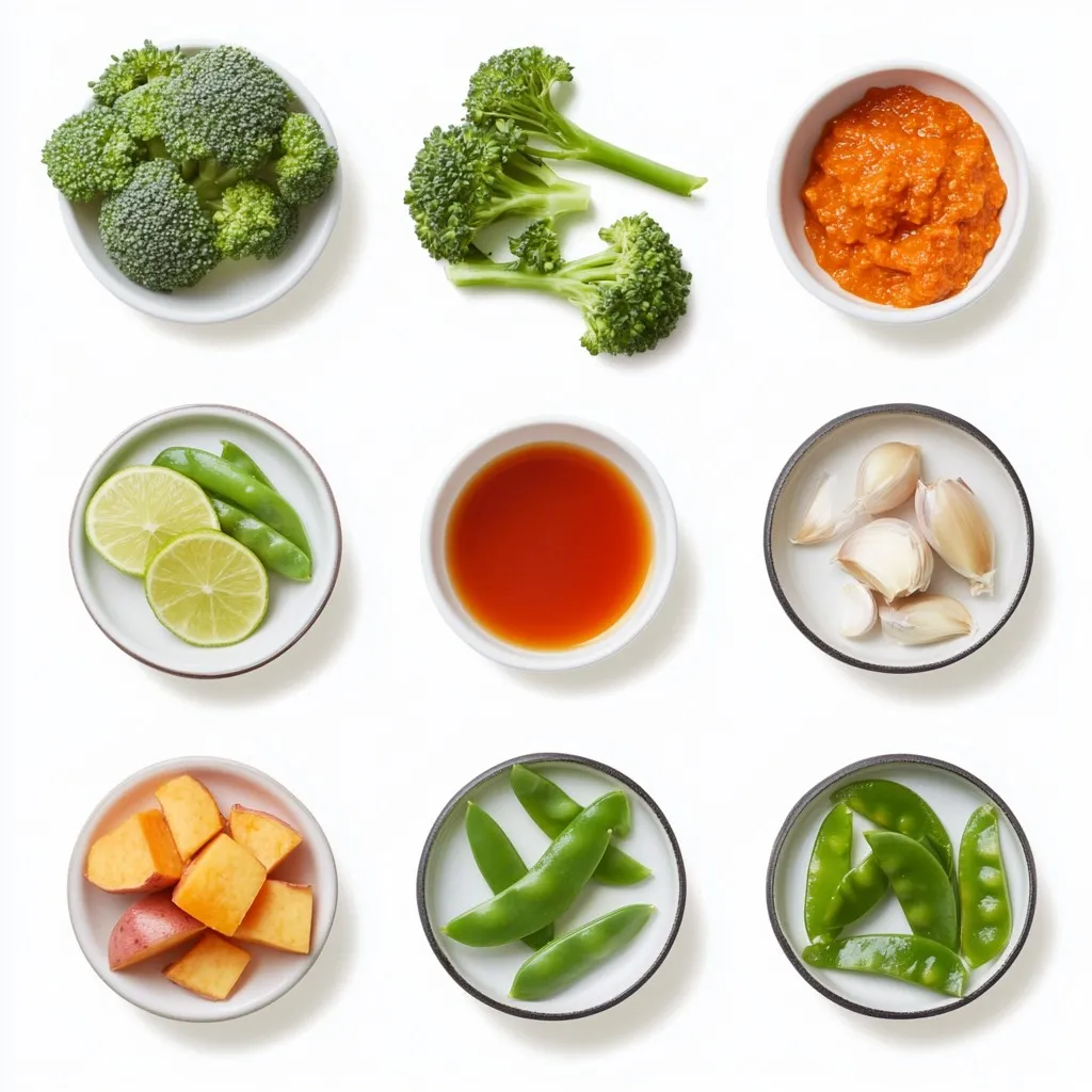 Before you start, gather your ingredients. You need coconut oil, onion, garlic, and ginger. Get your red curry paste, coconut milk, and vegetable broth ready too. Don’t forget the sweet potato, broccoli, snap peas, and red bell pepper. Have your lime juice, soy sauce, cilantro, and lime wedges nearby. This makes cooking smooth and fun.